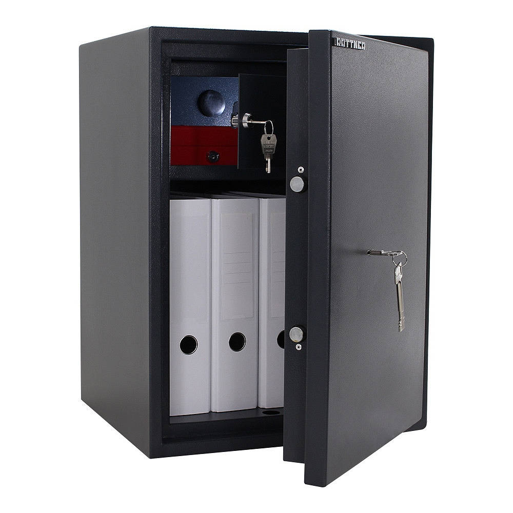 • Trezor je vybaven bezpečnostním motýlkovým zámkem třídy EN-Klasse 1 s pancířovou ochranou z manganové oceli (2x klíč).