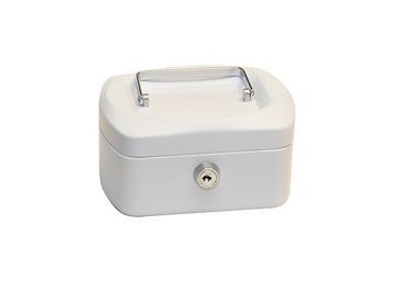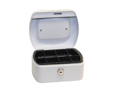 Uzamykatelná pokladnička z ocelového plechu k bezpečné úschově mincí a bankovek. Uvnitř se nachází vyjímatelná plastová vanička na mince pod kterou lze ukládat bankovky.
