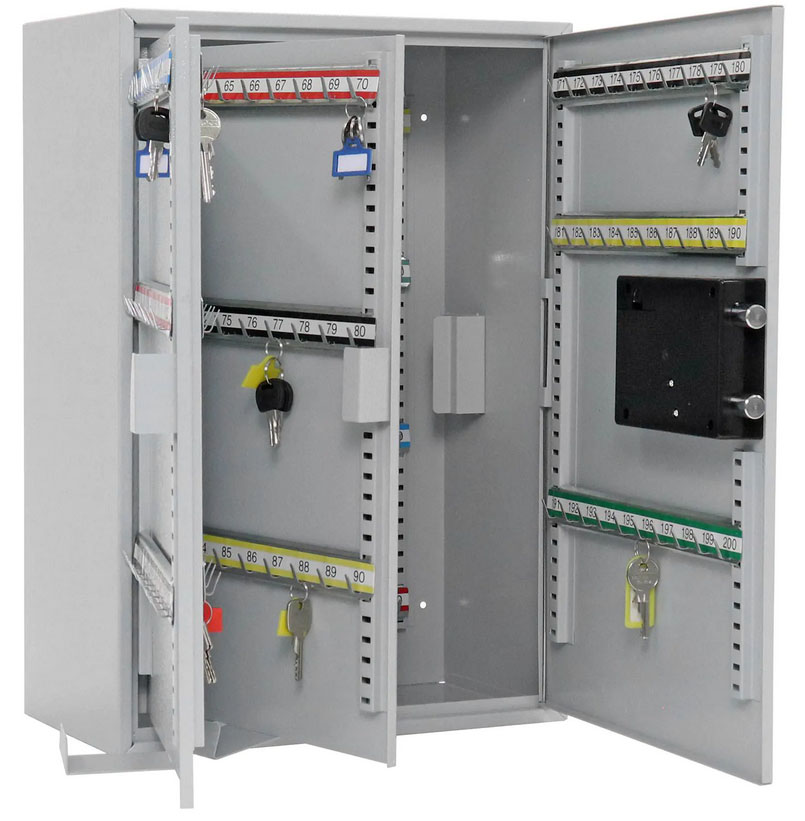 Skříňka na klíče z modelové řady S nabízí dostatek prostoru pro bezpečné a přitom stále přehledné uložení až 300 klíčů. Ty pěkně jeden vedle druhého můžete pověsit na fixně umístěny háčky. Háčky jsou umístěny na výškově posuvných lištách, které jsou barevně rozlišeny. Navíc, každý háček má své číslo. Uložené klíče jsou chráněny kvalitním ocelovým plechem a elektronickým zámkem. Přehledná klávesnice usnadňuje zadávání hesla a je spolu se zámkem napájena klasickými 1,5V bateriemi. Skříňku na klíče upevníte na stěnu pomocí otvorů na zadní straně. Potřebný materiál na upevnění je součástí dodávky.