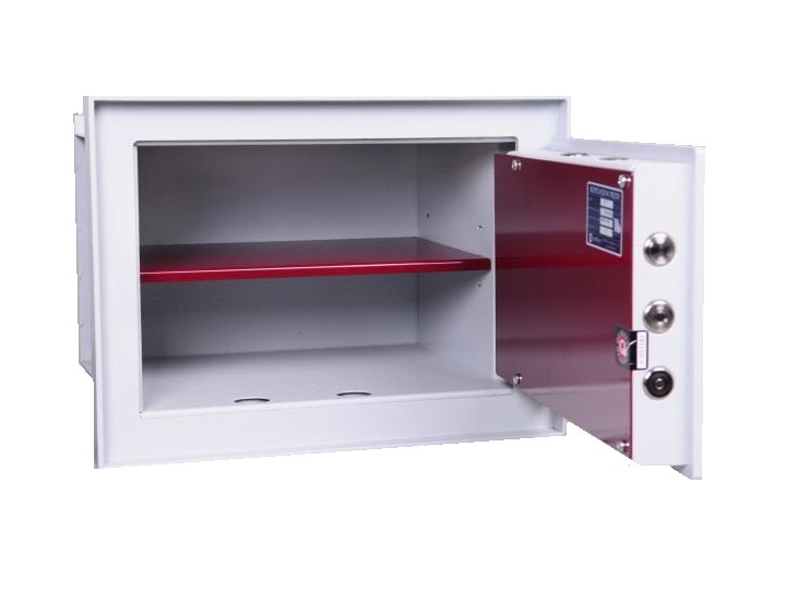 • Dvouplášťový stěnový trezor certifikovaný v I. bezpečnostní třídě s tloušťkou přední části dveří 8 mm (ocel).