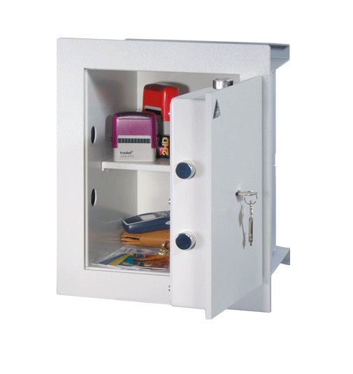 • Dvouplášťový stěnový trezor s ohnivzdorným lemem odolným proti slabému požáru (ohnivzdornost není certifikována).