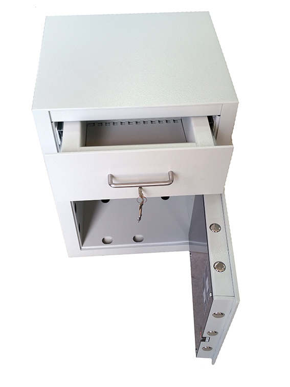 • Šuplík je osazen klíčovým trezorovým zámkem STUV, který lze na trezor navařit oboustranně tedy zvolit vhoz zadní nebo přední.